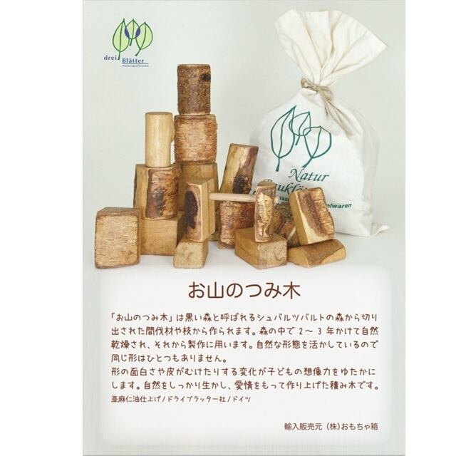 【素材・材質】●つみ木:ハンノキ、ハシバミ、カエデ、ヤナギ、カバ、ブナ ●袋:綿 ●仕上げ:亜麻仁油
