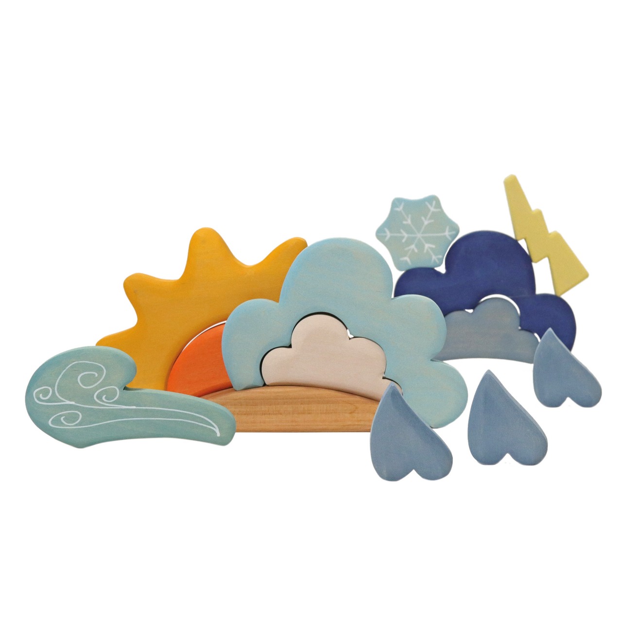 雷、太陽、雲、雪の優しい色合いのパーツを組み合わせて、お天気の物語を自由に作る事が出来ます。