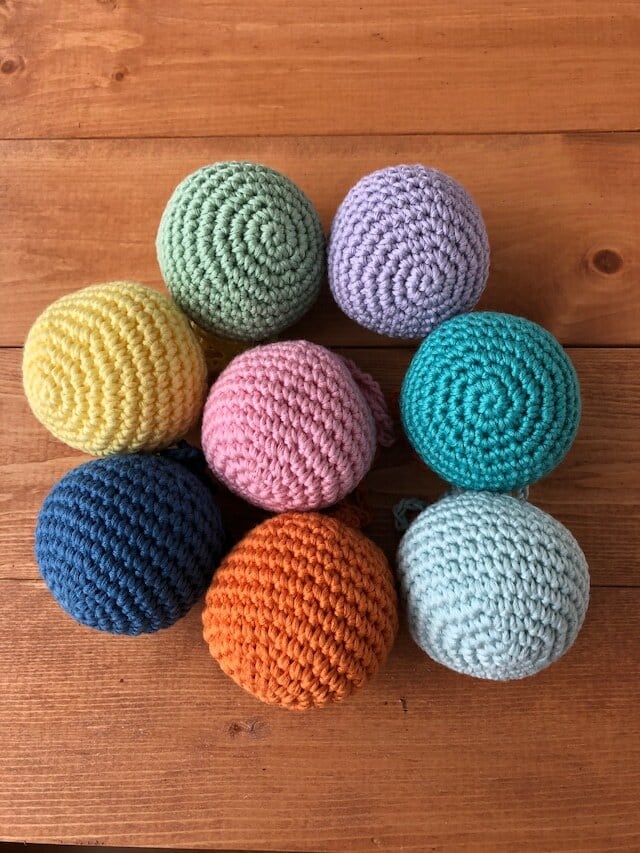子どもの心や意欲を大切に、幼稚園の生みの親である教育学者フレーベルが考案された教育遊具を元に、大きさや紐の長さ、色、数を目の前の子どもたちに合わせて、1つひとつ手作りで編まれたおもちゃです。